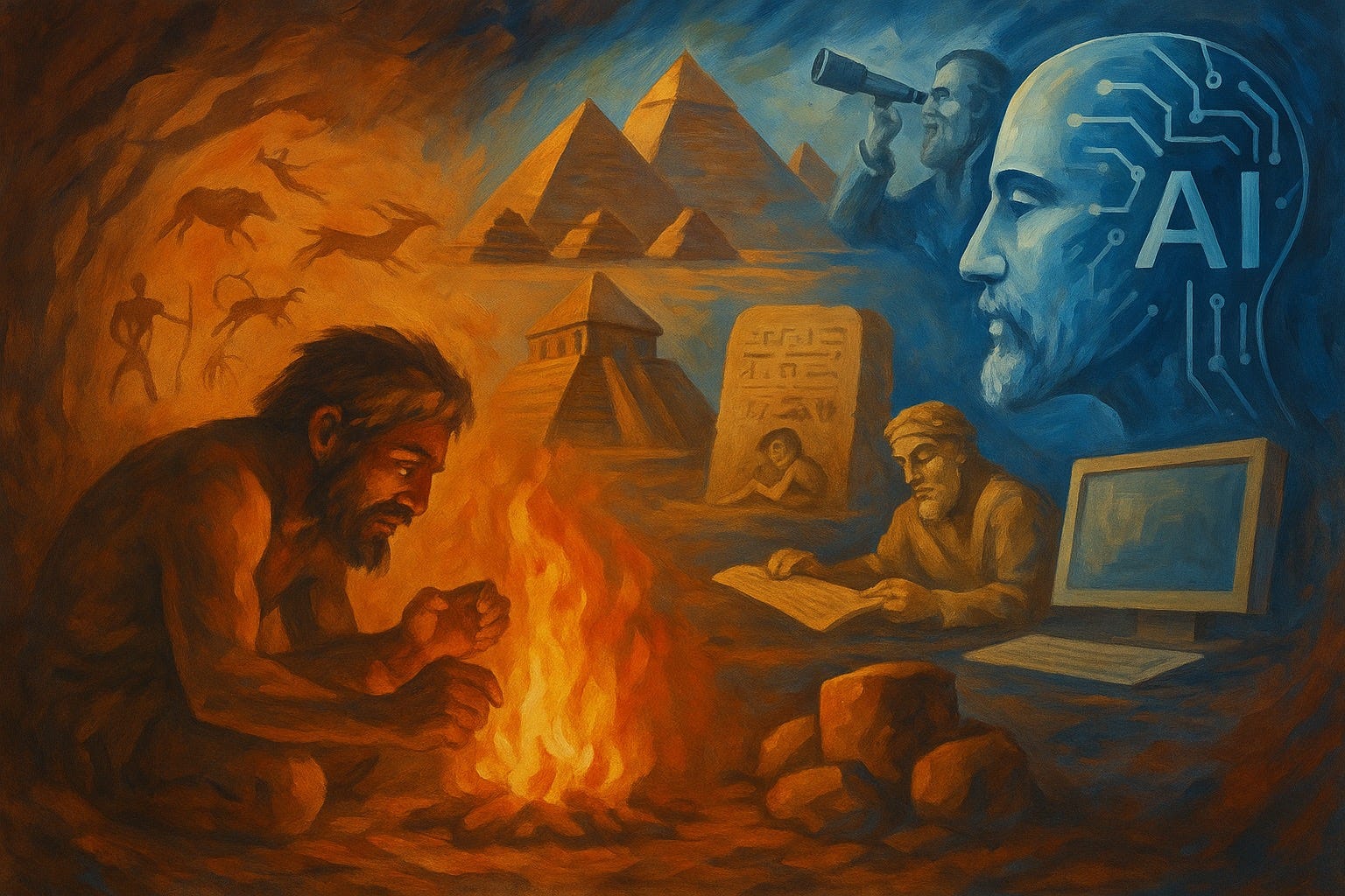 من تلك الشرارة البسيطة التي اكتشفها الإنسان قبل آلاف السنين، إلى عصر الإنترنت والذكاء الاصطناعي الذي نعيشه الان ، ومن حياة الكهوف البدائية إلى البيوت الذكية والطائرات والاتصالات العابرة للقارات، تطورت المعرفة البشرية بشكلٍ تراكمي، مدفوعة بالفضول، والرغبة في البقاء، والتطلّع إلى التقدم. تركيبة العقل البشري هو نفسه منذ خلق البشرية إلى يومنا هذا ، الذي يفرق هو تراكم المعرفة من جيل إلى آخر التي تغذي الذكاء البشري وتستحث قدراته